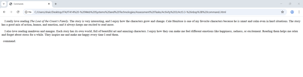 <p> I also love reading manhwas and mangas. Each story has its own world, full of beautiful art and amazing characters. I enjoy how they can make me feel different emotions like happiness, sadness, or excitement. Reading them helps me relax and forget about stress for a while. They inspire me and make me happy every time I read them.</p>