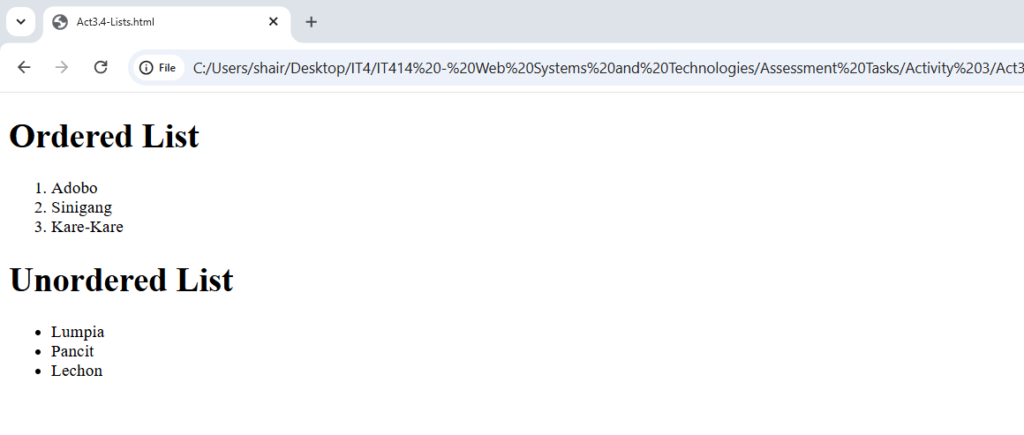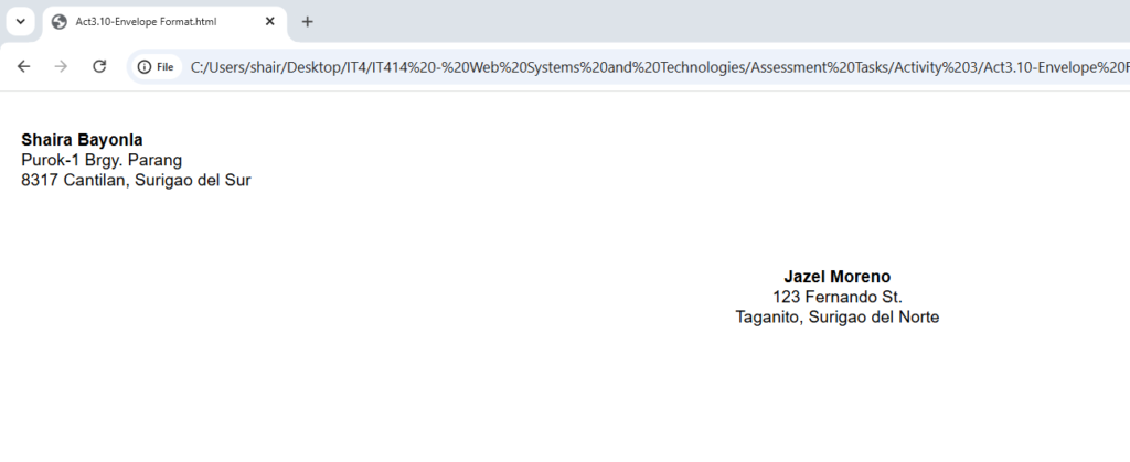 Hitting the spacebar multiple times in the code doesn't actually create space on the screen, which made the command a crucial discovery for manually forcing the text to align for the envelope exercise. I also found it interesting that I could change the default bullet points to squares just by adding a simple "type" attribute, which gave me more control over the list's appearance than I expected.