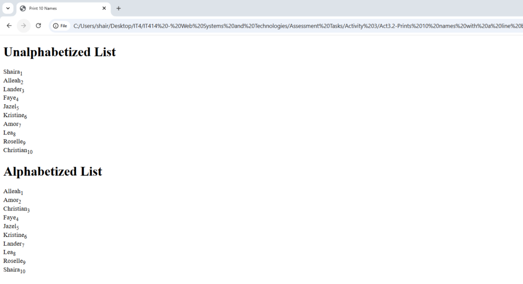 let names = ["Shaira", "Alleah", "Lander", "Faye", "Jazel", "Kristine", "Amor", "Lea", "Roselle", "Christian"];