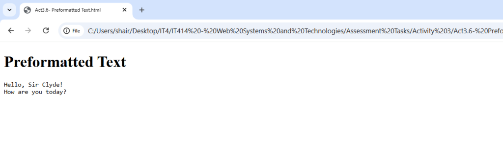 <h1>Preformatted Text </h1>