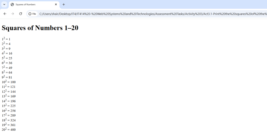 <h1>Squares of Numbers 1–20</h1>
